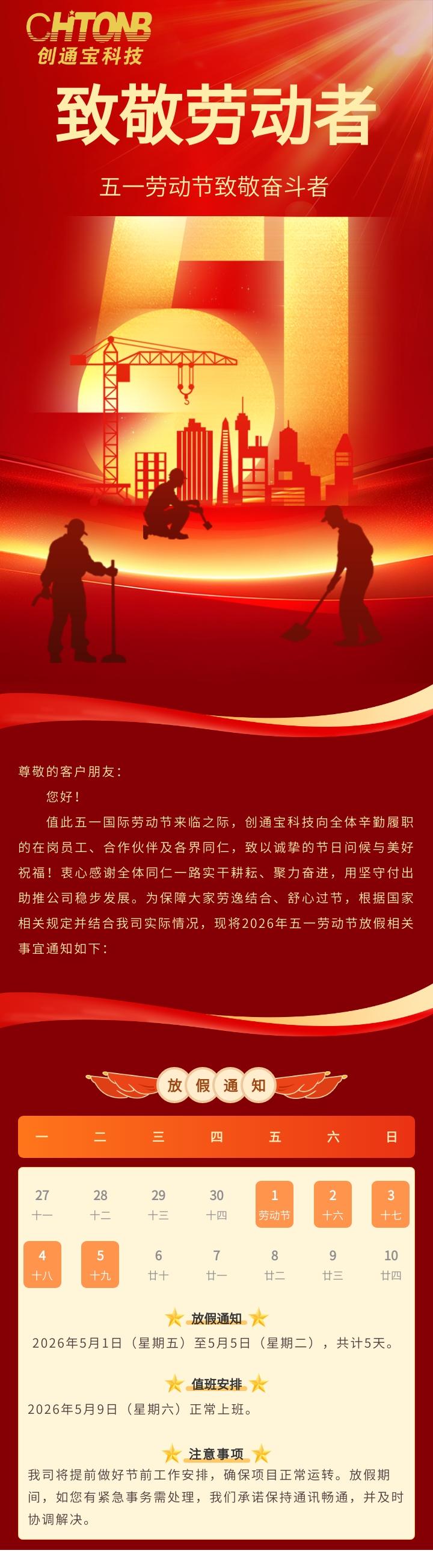 值此五一国际劳动节来临之际,创通宝科技向全体辛勤履职的在岗员工、合作伙伴及各界同仁,致以诚挚的节日问候与美好祝福!衷心感谢全体同仁一路实干耕耘、聚力奋进,用坚守付出助推公司稳步发展。为保障大家劳逸结合、舒心过节,根据国家相关规定并结合我司实际情况,现将2026年五一劳动节放假相关事宜通知如下: