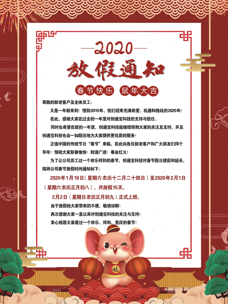 为了让公司员工过一个欢乐祥和的春节,创通宝科技对春节假日提前和延长,现将公司春节放假时间通知如下: